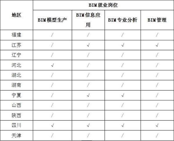 3、就業(yè)崗位分布。從11個(gè)省市的BIM就業(yè)崗位分布來看,不同地區(qū)的企業(yè)對(duì)BIM人才的崗位需求也各不相同,BIM技術(shù)應(yīng)用發(fā)達(dá)的地區(qū)更需要能將BIM技術(shù)與生產(chǎn)過程融合的復(fù)合型人才,不局限于BIM建模工作,例如江蘇省企業(yè)招聘的人員以BIM信息應(yīng)用,BIM專業(yè)分析和BIM項(xiàng)目管理為主。