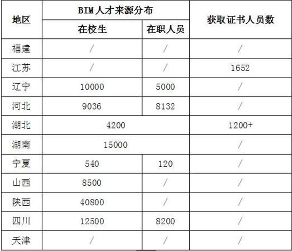 1、來源分布。11個(gè)省市提供的數(shù)據(jù)表明,BIM人才主要來源于在校學(xué)生,以及接受BIM相關(guān)培訓(xùn)的企業(yè)在崗人員,詳見表所示。